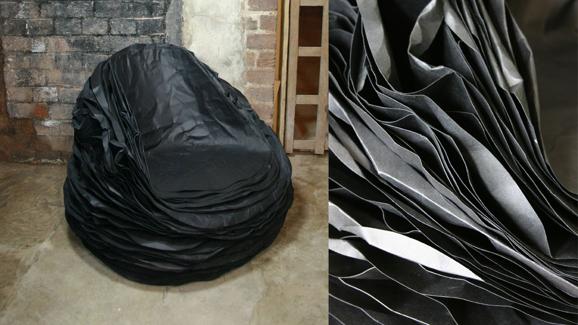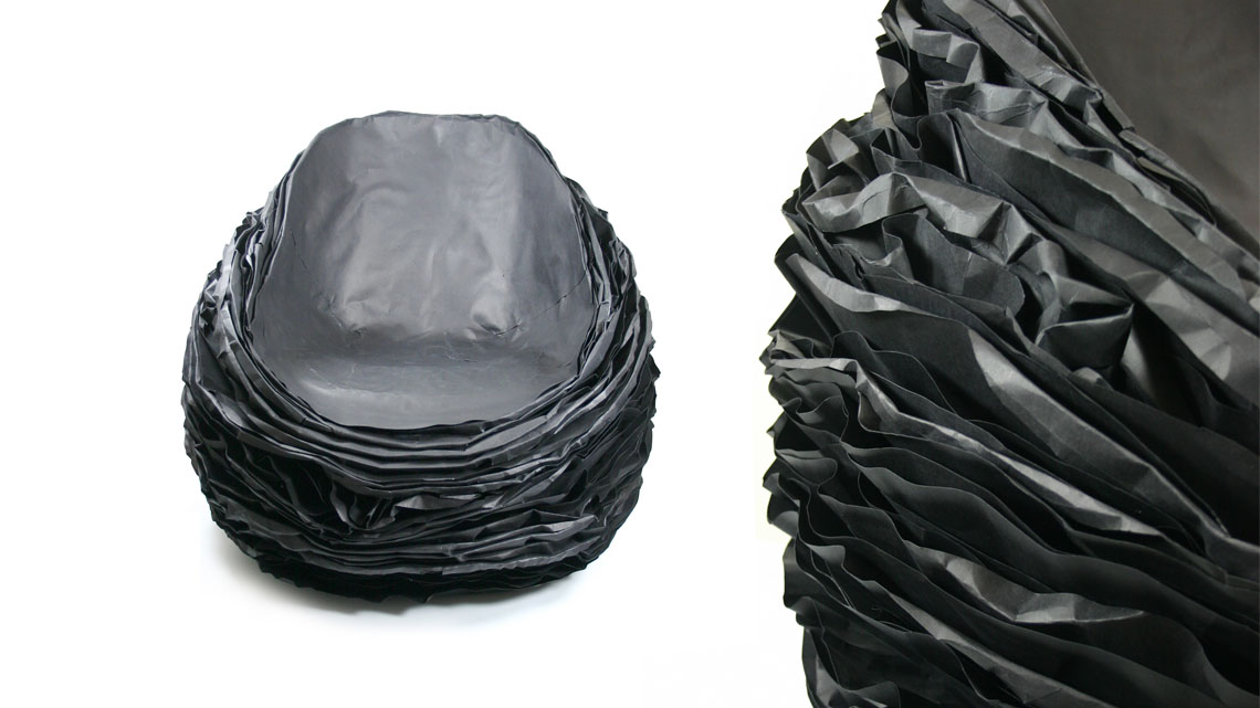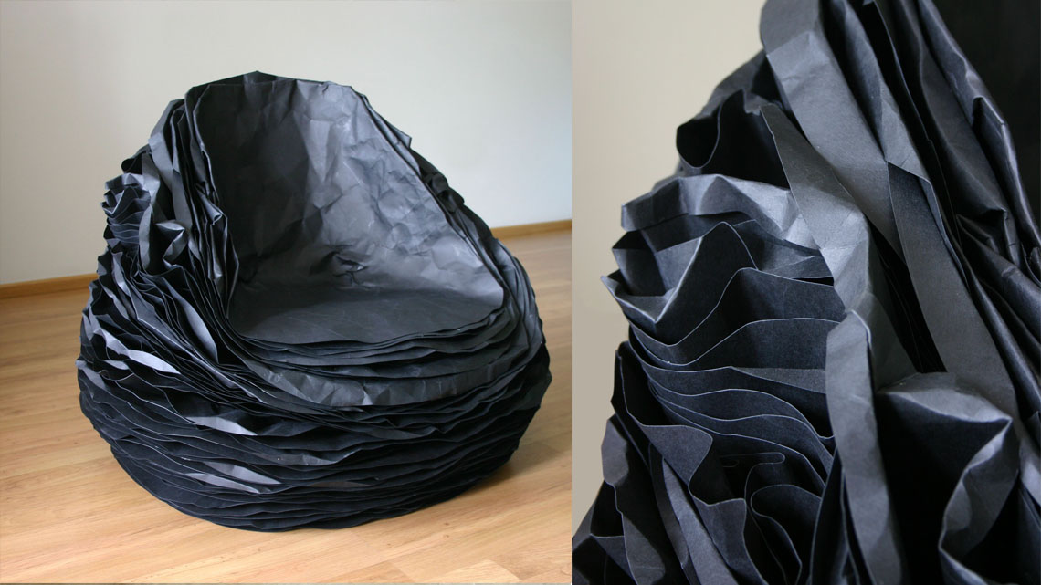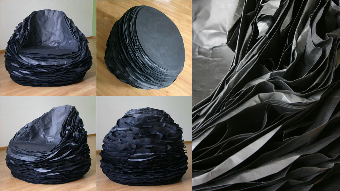 A distinctive texture of the chairs’ overlay encourages a dialog with a user. A distinctly personalized form of the chair can be created by rumpling and chopping paper layers.