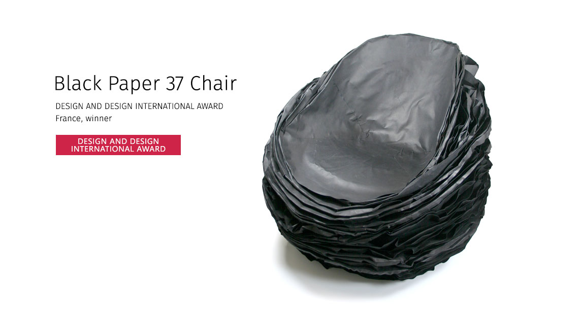 Low paper armchair Black Paper 37- is a result of experiments with various materials and exploration of the co-existence of, ‘Chaos and Sequence’. The armchair is made of 37 paper layers and 20 details of gofer cardboard. The functional surface is formed by putting paper layers one by one to archive the required height on the chair.
