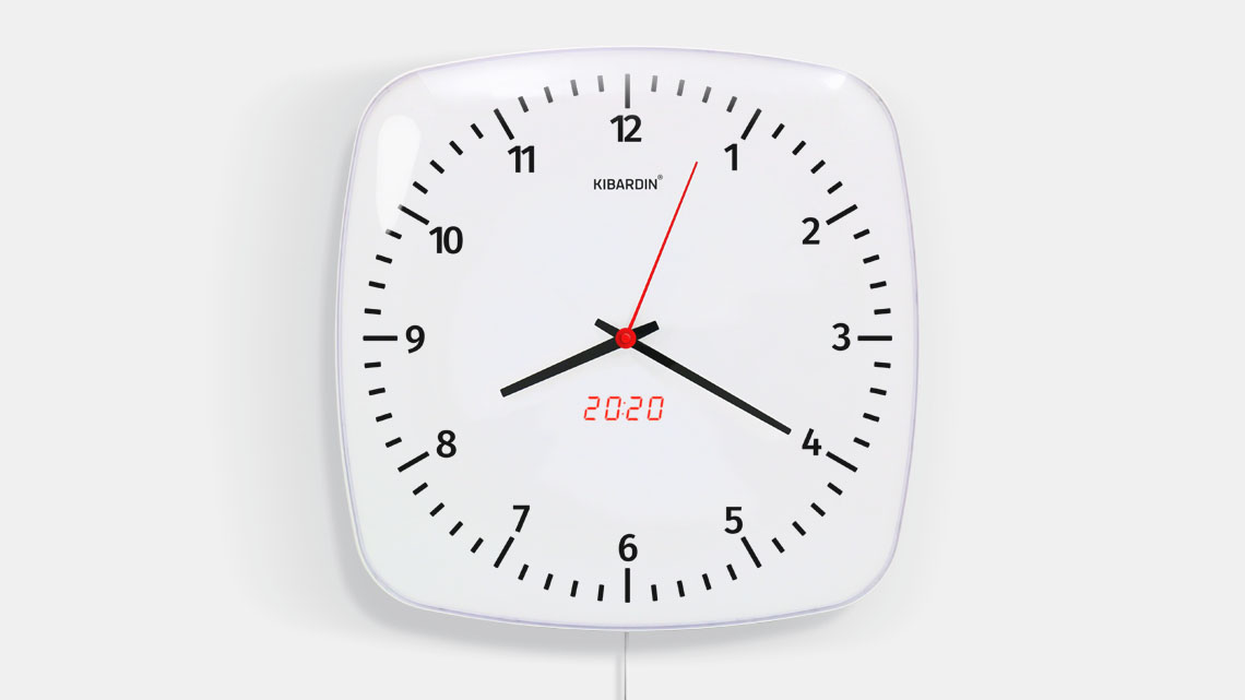This KIBARDIN Classic clock measures 346mm x 346mm x 43mm and is available in white, with a red LED digital module display. At KIBARDIN we understand and adhere to the principles of great design. Simplicity and functionality are fundamental to the KIBARDIN philosophy. Clocks are made to last, built from superior quality raw materials, and have easy-to-read dials and simple-to-operate functions.