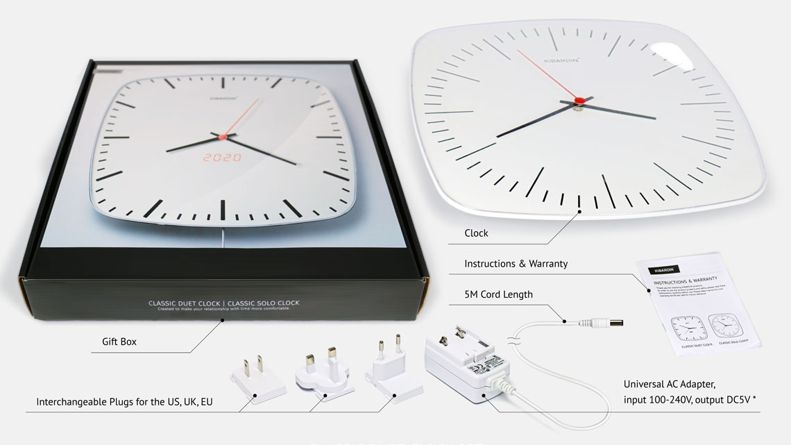 Power adapters are essential equipment, no matter what country you live in. Our clock is equipped with one AC adapter with interchangeable plugs for the US, UK, EU covering the whole world.