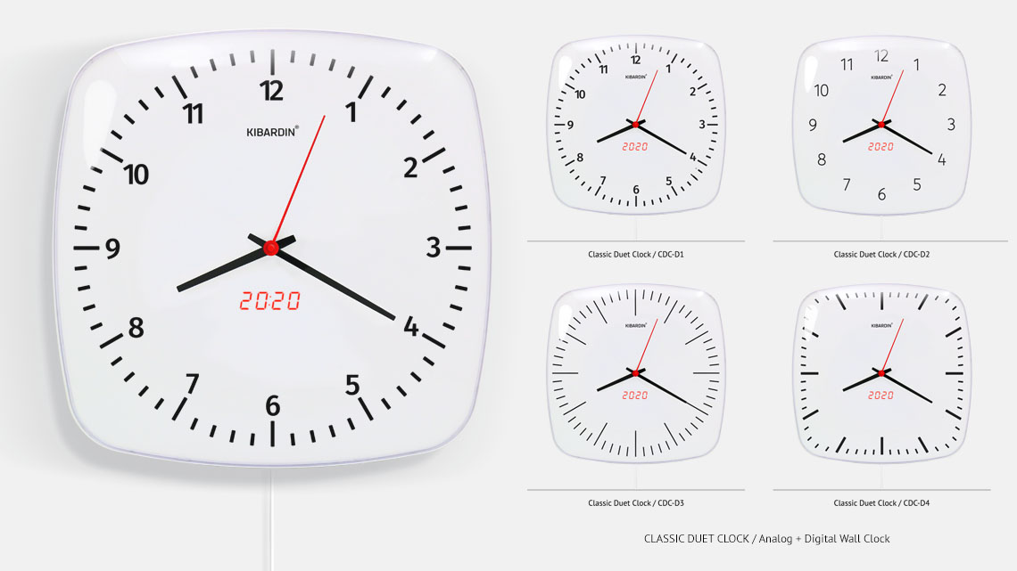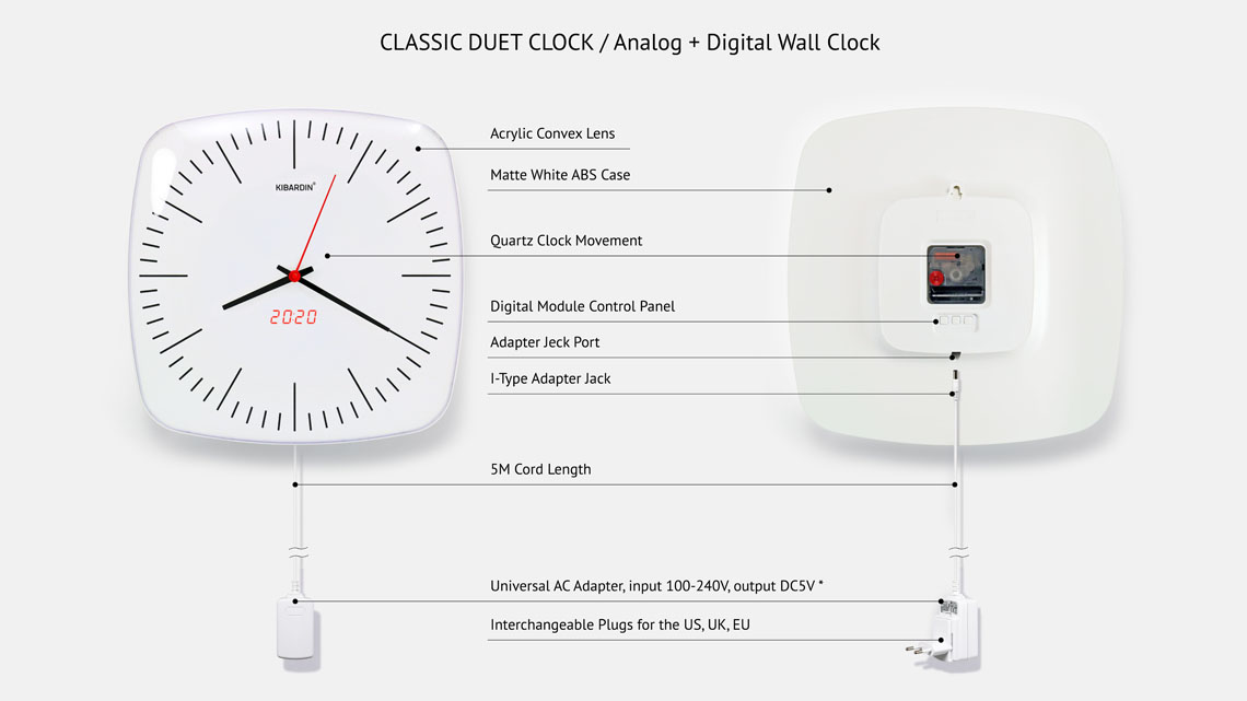 These wall clocks not only display the accurate time in your home, they also add a retro-futuristic accent to your décor. Classic designs with Arabic numerals, indexes, and different stick combinations, in addition to modern digital interfaces mean this collection of clocks can be used in virtually any setting – including kitchens, home and business offices, and social interiors. The digital module of the Classic Duet Clock runs only on mains electricity power, however, the CPU operates automatically and maintains the time in case of mains power outages.