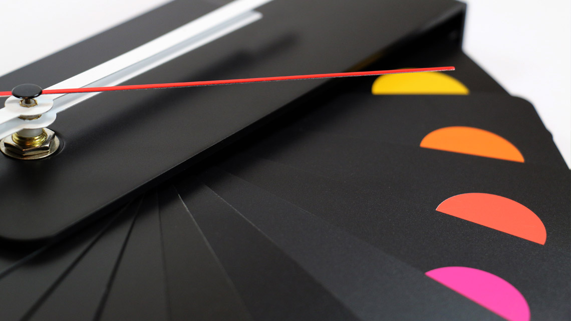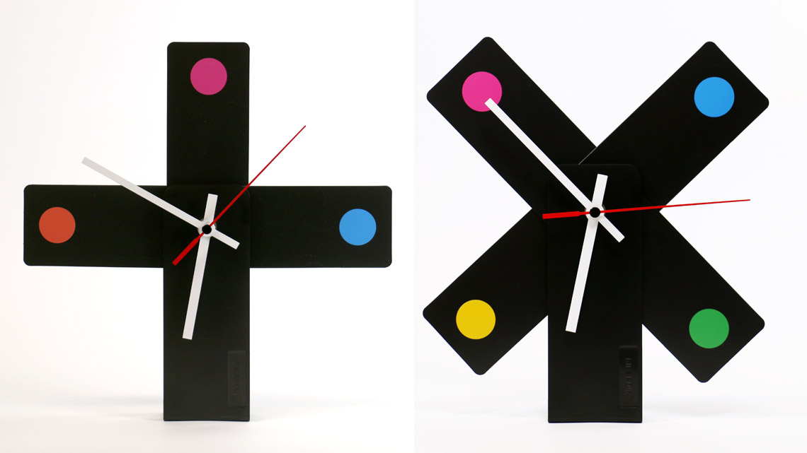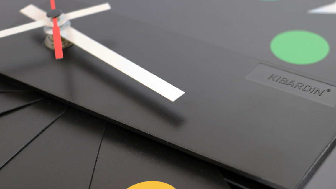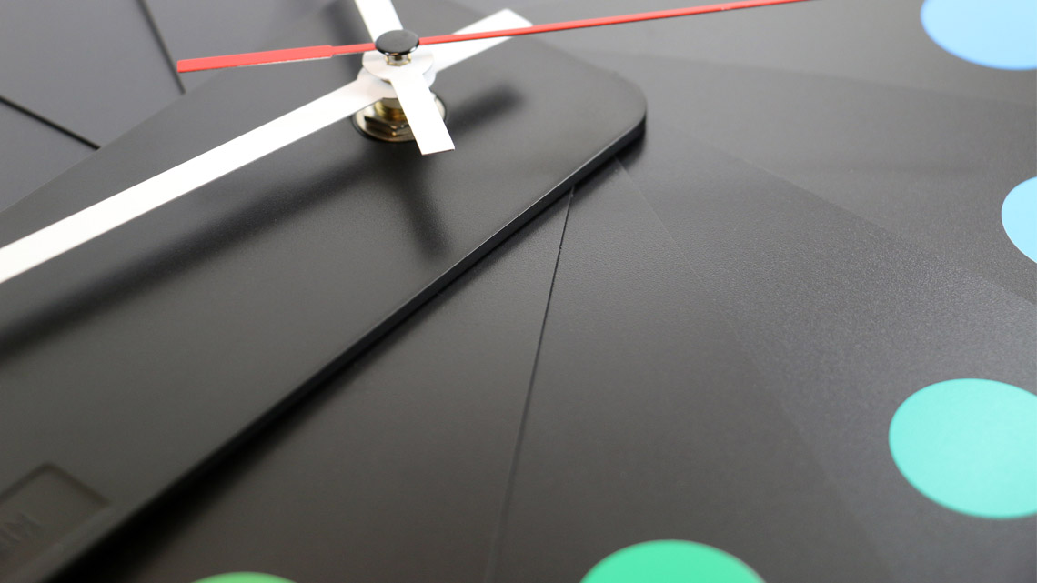 Eight unique color combinations let you more strongly feel the wide range of characteristics associated with this design. The Transformer Clock comes in Black or White, Monochrome, Multicolor, and Spotted color systems. Black hands are seated against the warm white body, and white hands are used on the black case. It is always easy to read the time due to the sharp lines and contrast in colors between the hands and the background.