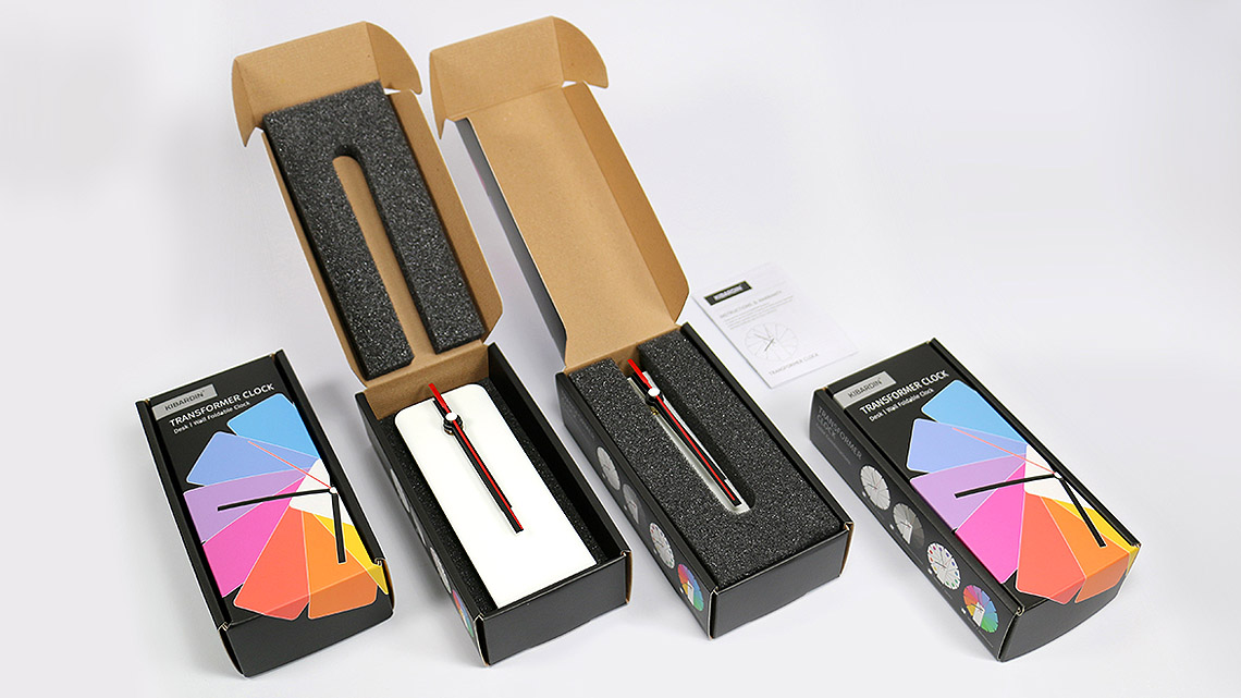 Eight unique color combinations let you more strongly feel the wide range of characteristics associated with this design. The Transformer Clock comes in Black or White, Monochrome, Multicolor, and Spotted color systems. Black hands are seated against the warm white body, and white hands are used on the black case. It is always easy to read the time due to the sharp lines and contrast in colors between the hands and the background.