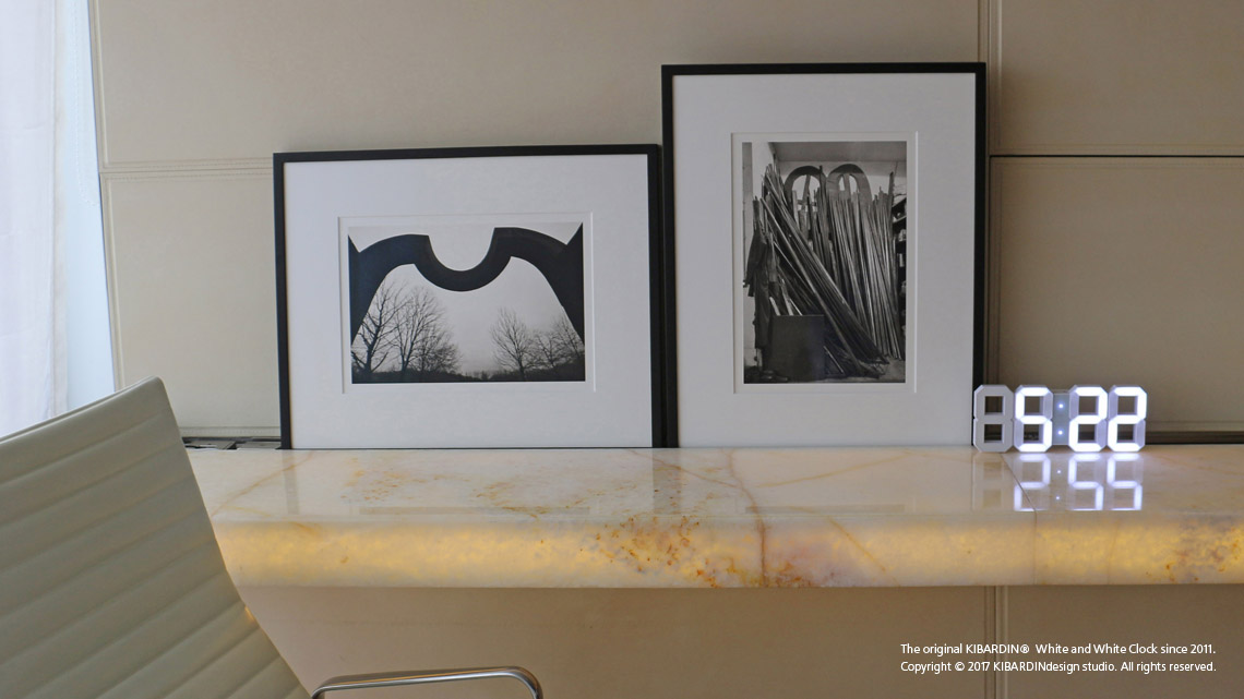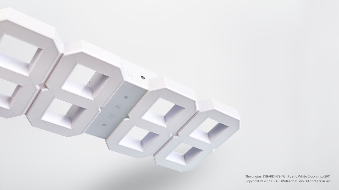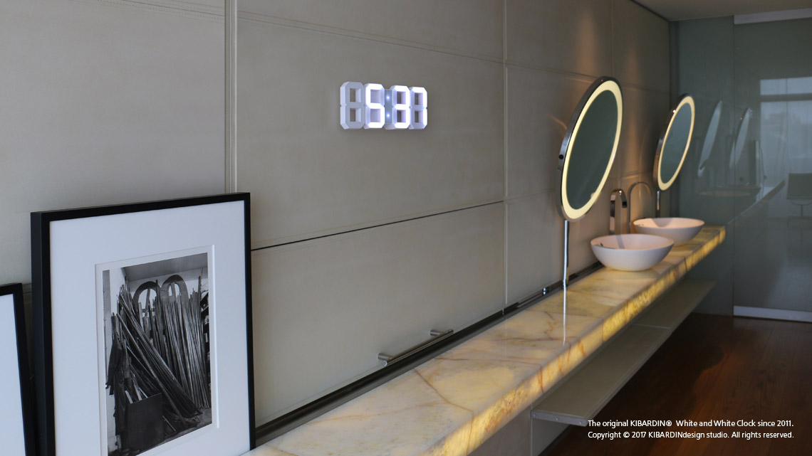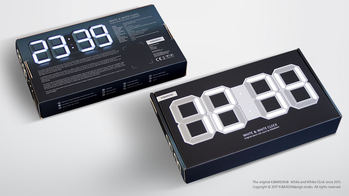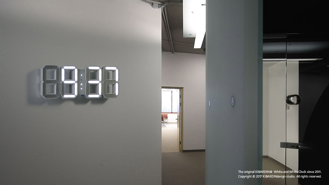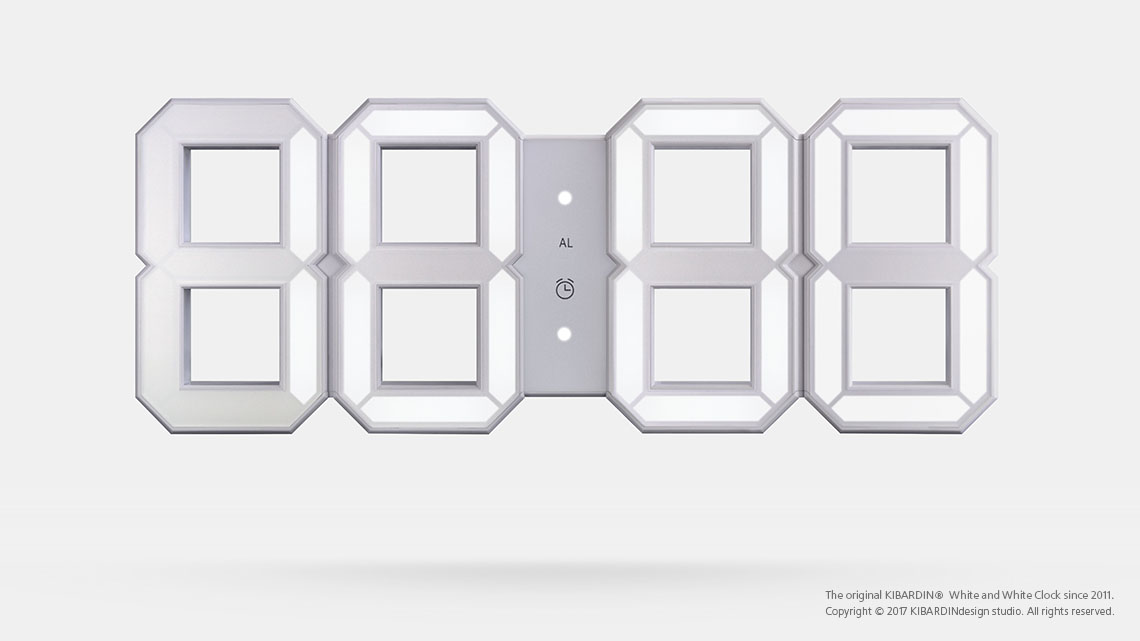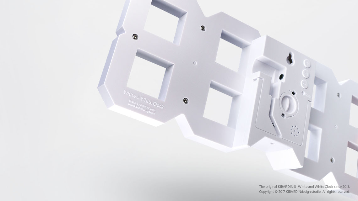 Digital wall/desk white LED clock with white frame digits. Nothing else, simply time. White & White Clock is a clock with an alarm and time display mode 24 hour. In dark hours the light sensitive sensor changes the brightness of the digits to a less intense white. The power supply is conducted through a general mains-operated adapter that suits any kinds of sockets.