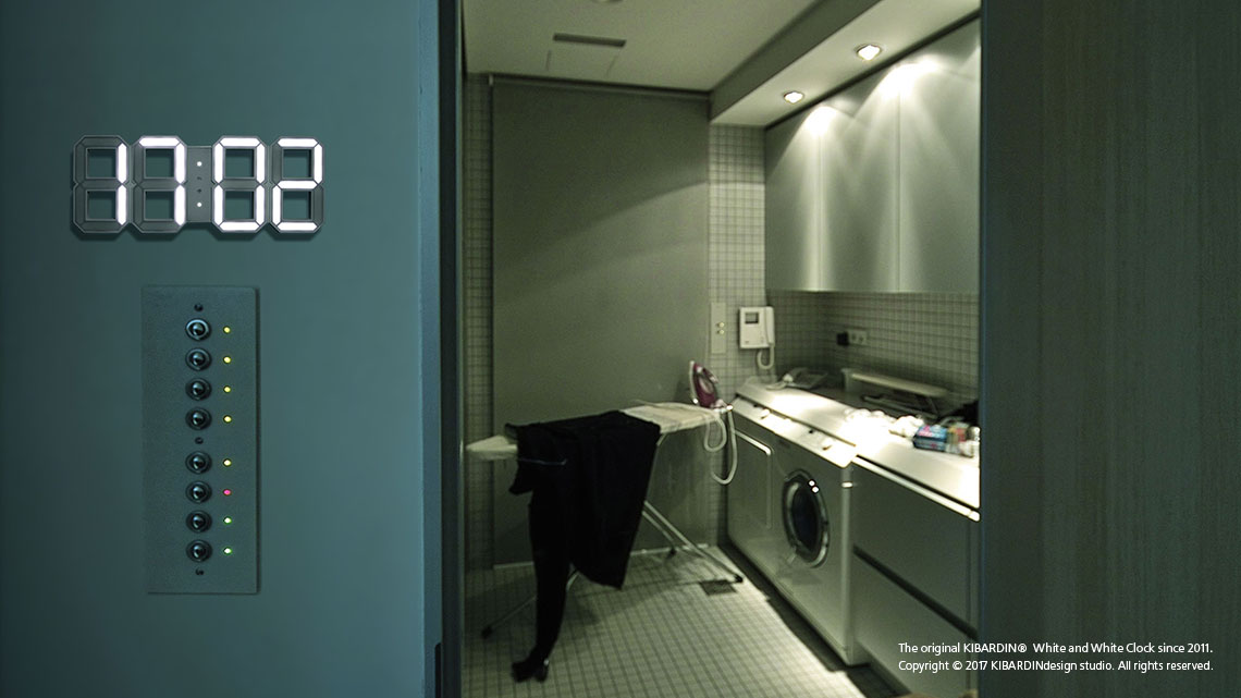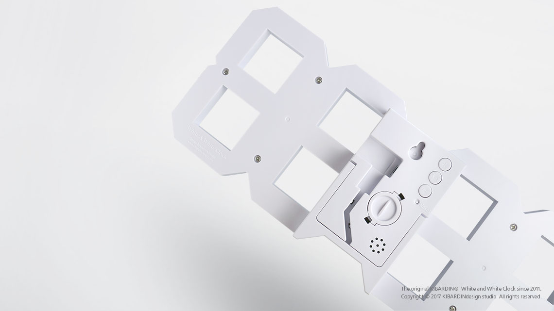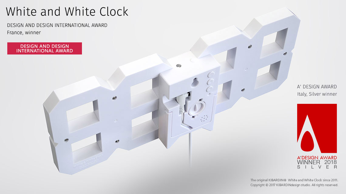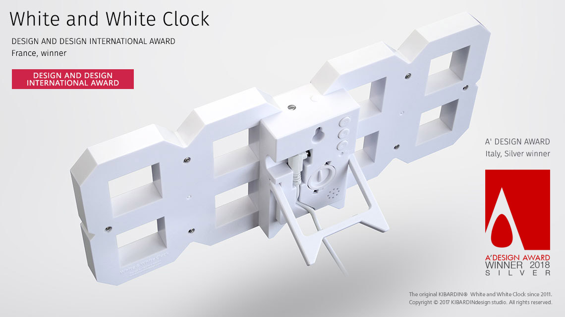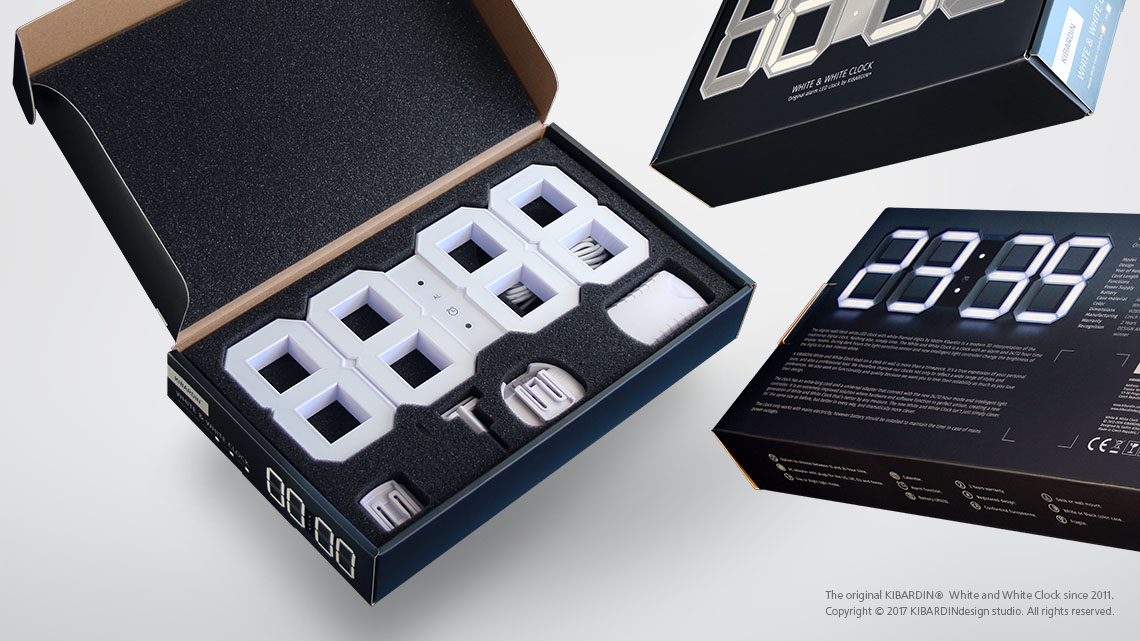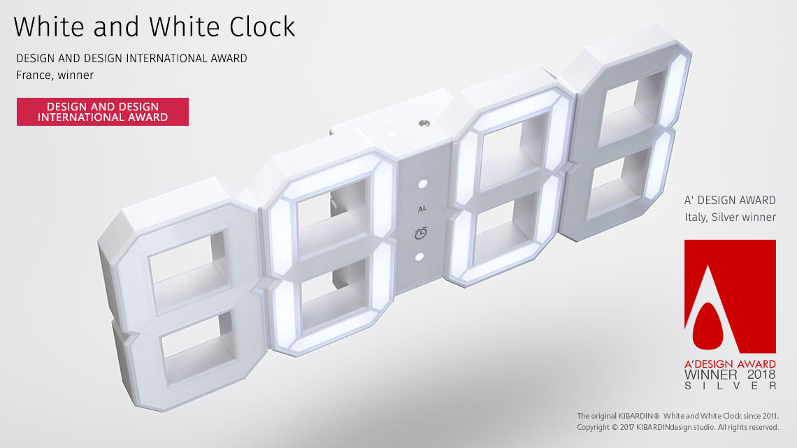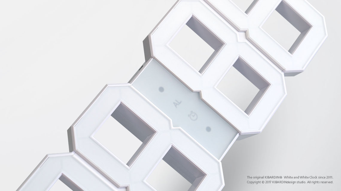 Digital wall/desk white LED clock with white frame digits. Nothing else, simply time. White & White Clock is a clock with an alarm and time display mode 24 hour. In dark hours the light sensitive sensor changes the brightness of the digits to a less intense white. The power supply is conducted through a general mains-operated adapter that suits any kinds of sockets.